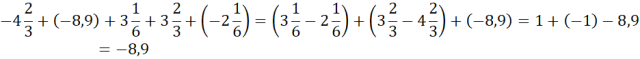Zapisz w jednym nawiasie różnicę ułamków o mianowniku 6, a w drugim różnicę ułamków o mianowniku 3. Wykonaj odejmowania w nawiasach, pamiętaj, żeby odejmować od większej wartości bezwzględnej mniejszą i wstawiać znak większej liczby pod wartością bezwzględną. Zwróć uwagę, wyniki w nawiasach są liczbami do siebie przeciwnymi – ich suma wynosi 0.