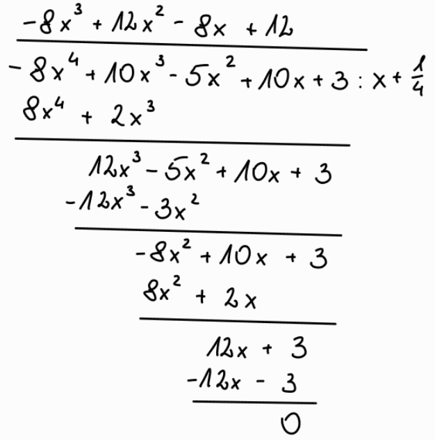 Zgodnie z twierdzeniami o pierwiastkach całkowitych i wymiernych wielomianu sprawdzasz, które liczby są jego pierwiastkami. Po ustaleniu danej liczby wykonujesz dzielenie pisemne wielomianu. Wynikiem dzielenia jest wielomian stopnia trzeciego, który sprowadzasz do najprostszej postaci, co umożliwi ustalenie wszystkich pierwiastków wielomianu.