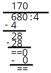 680 : 4 = (600 + 80) : 4 = 600 : 4 + 80 : 4 = 150 + 20 = 170