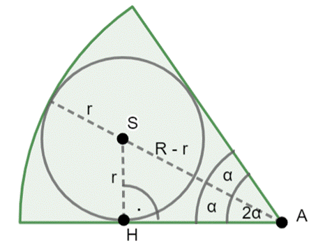 Narysuj wycinek koła, zaznacz na rysunku promień okręgu wpisanego i wyprowadź promień wycinka koła z punktu A. Zauważ, że promień R i r przecinają się w punkcie S, tworząc trójkąt HAS. Wyznacz pole tego trójkąta–i na jego podstawie określ kąt leżący naprzeciwko boku |HS|, czyli promienia okręgu wpisanego. Kąt |∡A| = 2α, a na podstawie tego wyrażenia, wyznacz pole wycinka koła.