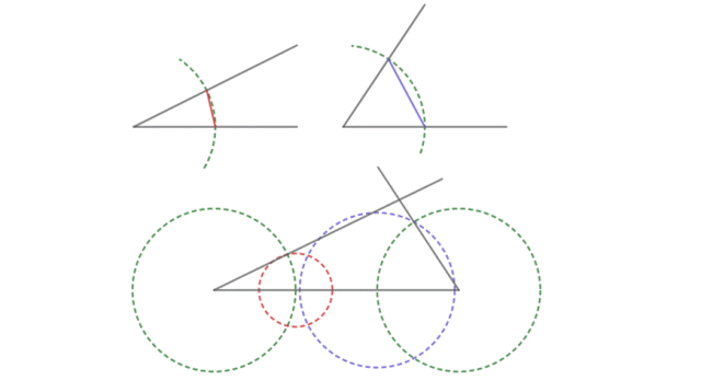 Narysuj dwa dowolne katy ostre. Teraz zastanówmy się, oba kąty muszą znaleźć się przy jednym z boków trójkąta, czyli potrzebujemy pewnego odcinka, który będzie podstawą figury. Na jednym jego końcu znajdzie się jeden z narysowanych kątów, a na drugim końcu – drugi kąt. Zatocz łuki na narysowanych kątach i ponów tę czynności, wbijając cyrkiel w końce narysowanego odcinka. Następnie odmierz cyrklem odległość pomiędzy ramionami kątów w miejscu przecięcia się ich z łukami. Za każdym razem, po odmierzeniu, wbij cyrkiel w odpowiednie przecięcie się odcinka z pierwszym łukiem, i zataczaj łuki, by się przecięły – w ty miejscu znajduje się punkt należący do boku trójkąta. Po wykonaniu tych czynności z obu stron przedłuż ramiona, by przecięły się ze sobą, tworząc trzeci wierzchołek trójkąta.