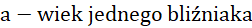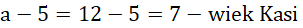 Oznaczasz wiek bliźniaka niewiadomą a, następnie zapisujesz wiek Kasi, która jest o 5 lat młodsza od swoich braci bliźniaków. Dodajesz wiek całej trójki, tworząc proste równanie. Następnie musisz je rozwiązać, czyli dodajesz wszystkie wyrazy podobne i liczby do siebie. Potem musisz podzielić obie strony równania przez liczbę stojącą przy niewiadomej a. Otrzymujesz wiek brata bliźniaki. Obliczasz wiek Kasi, odejmując od wieku brata 5 lat.