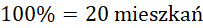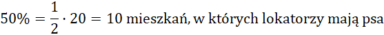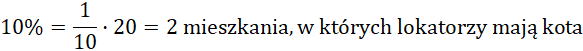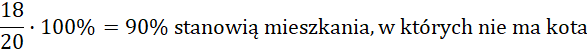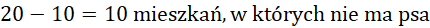 W bloku jest 20 mieszkań, czyli 100%. Mieszkania, w których jest kot, stanowią 10% całości, czyli są to 2 mieszkania. W 50% wszystkich mieszkań jest pies, czyli w 10 mieszkaniach. Kota nie ma w 18 mieszkaniach, ponieważ musisz odjąć od liczby wszystkich mieszkań, te mieszkania, w których jest kot. Następnie musisz podzielić tę liczbę, przez liczbę wszystkich mieszkań i pomnożyć razy 100%, aby uzyskać wynik w procentach. W 10 mieszkaniach jest pies, czyli aby obliczyć, w ilu mieszkaniach psa nie ma, musisz odjąć od liczby wszystkich mieszkań, liczbę tych, w których pies jest.
