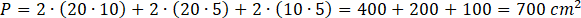 Wiedząc, że wysokość prostopadłościanu ma 20 cm, jego długość to 50%, szerokość 25% wysokości, oblicz długość krawędzi prostopadłościanu oraz jego pole.