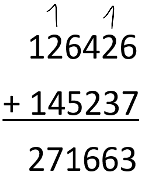 Aby dodać dwie liczby sposobem pisemnym, dodaj cyfry w tych samych kolumnach i zapisz ich sumę pod kreską w tej samej kolumnie. Jeśli wynik jest większy od 9, cyfrę jedności napisz w tej samej kolumnie, a cyfrę dziesiątek dodaj do następnej kolumny po lewej.