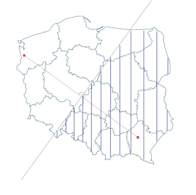 Najpierw połącz Rzeszów i Szczecin odcinkiem. Na rysunku jest on czerwony. Narysuj teraz symetralną tego odcinka. Na rysunku jest ona czarna – przechodzi przez środek czerwonego odcinka i przecina go pod kątem prostym. Zakreskuj tę część Polski, która znajduje się po tej stronie symetralnej co Rzeszów.