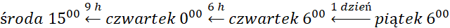Najpierw przeliczamy czas działania zegara na pełne dni i godziny pamiętając, że 1 dzień to 24 godziny, a następnie cofamy się kolejno o pełne dni, do północy danego dnia, a na koniec o pozostałe godziny.