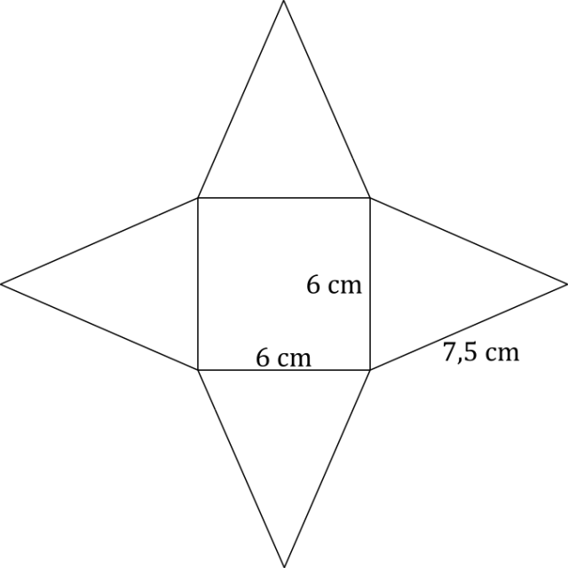 Krawędź podstawy tego ostrosłupa ma długość 6 cm, ponieważ 6 ∙ 6 = 36. 15 mm = 1,5 cm, więc krawędź boczna ma długość 6 + 1,5 = 7,5 cm.