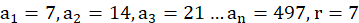 Określ ciąg, który tworzą liczby naturalne podzielne przez 7 i mniejsze od 500. Jego różnica będzie równa 7, stąd wzór ciągu możesz opisać jako