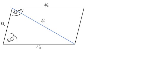 Wykonaj rysunek. Oblicz długość boku a stosując twierdzenie cosinusów. W rozwiązaniu otrzymasz dwie możliwe odpowiedzi, a = 6 lub a = 10. Oblicz pola równoległoboku, dla obu wymiarów.