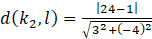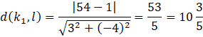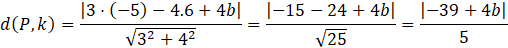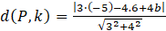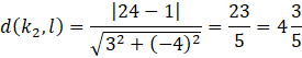 Najpierw wyznacz współczynnik kierunkowy prostej k, skorzystaj z własności równoległości prostych. Następnie skorzystaj ze wzoru na odległość punktu od prostej