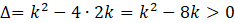 Aby równanie kwadratowe miało dwa (jakiekolwiek) rozwiązania, jego wyróżnik musi być dodatni. Wyznacz wartość wyróżnika w zależności od wartości parametru k, a następnie wyznacz wartości parametru, dla których jest on dodatni.