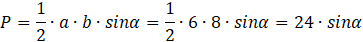 Pole równa się połowie iloczynu długości 2 boków oraz sinusa kąta pomiędzy nimi. Zauważ, że pole będzie największe, jeśli