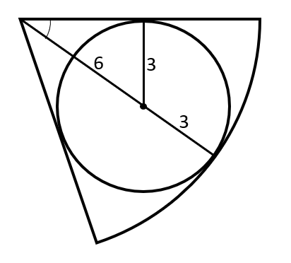 Wykonaj rysunek pomocniczy, na którym zaznacz promień koła przechodzący przez środek okręgu. Następnie poprowadź promień okręgu do punktu styczności z promieniem koła. Otrzymasz trójkąt prostokątny o przeciwprostokątnej długości 6 cm i przyprostokątnej długości 3 cm. Oblicz miarę kąta ostrego, korzystając przy tym z wartości jego sinusa. Kąt środkowy wyznaczający wycinek koła ma miarę dwukrotnie większą od kąta w trójkącie. Aby obliczyć pole wycinka skorzystaj ze wzoru