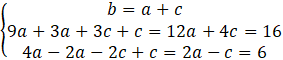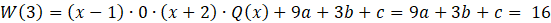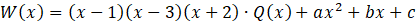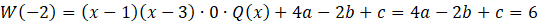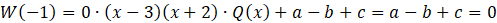 Do tak zapisanego wzoru wielomianu podstaw wartości -2 i 3, a następnie otrzymane wyrażenia przyrównaj do reszt z dzielenia W(x) przez odpowiednio x + 2 oraz x – 3. Następnie podstaw za x wartość 1, ponieważ W(x) jest podzielny przez x – 1, W(1) = 0.