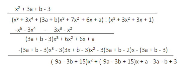 Aby -1 było pierwiastkiem trzykrotnym wielomianu W(x), wielomian musi być podzielny bez reszty przez (x + 1)3. Wykonaj dzielenie wielomianu sposobem pisemnym, a następnie przyrównaj do zera otrzymaną liczbę (a właściwie współczynniki stojące przy x2 i x oraz wyraz wolny). Otrzymasz układ równań, który rozwiąż metodą podstawiania, wyznaczając przy tym wartości a i b.