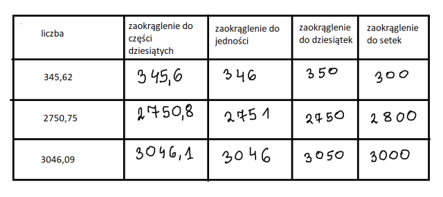 Zaokrąglenie do części dziesiątych to zaokrąglenie do pierwszego miejsca po przecinku. Zaokrąglenie do jedności to zaokrąglenie do pierwszej liczby przed przecinkiem. Zaokrąglenie do setek to zaokrąglenie do drugiego miejsca przed przecinkiem. Zaokrąglenie do setek to zaokrąglenie do trzeciego miejsca przed przecinkiem.