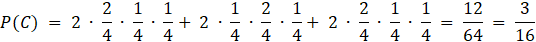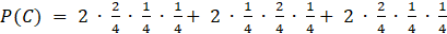 W tym zadaniu musisz, korzystając z drzewa, obliczyć prawdopodobieństwo zdarzeń A – co najmniej raz wypadła ścianka w kolorze niebieskim, B – we wszystkich rzutach wypadły ścianki w takim samym kolorze, C – w każdym rzucie wypadł inny kolor ścianki od pozostałych, jeśli symetryczna czworościenna kostka posiada dwie ścianki w kolorze białym, jedną – w kolorze niebieskim i jedną – w kolorze zielonym i rzucamy nią trzy razy.