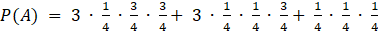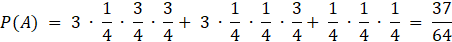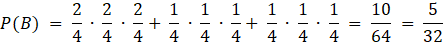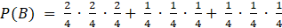 Aby zaszło zdarzenie A, ścianka w kolorze niebieskim może wypaść 1 raz, 2 razy lub 3 razy, przy czym sposobów na wypadnięcie jej 1 i 2 razy jest po 3. Zsumuj otrzymane prawdopodobieństwa. Analogicznie postępuj w następnych zdarzeniach. Otrzymasz wówczas