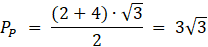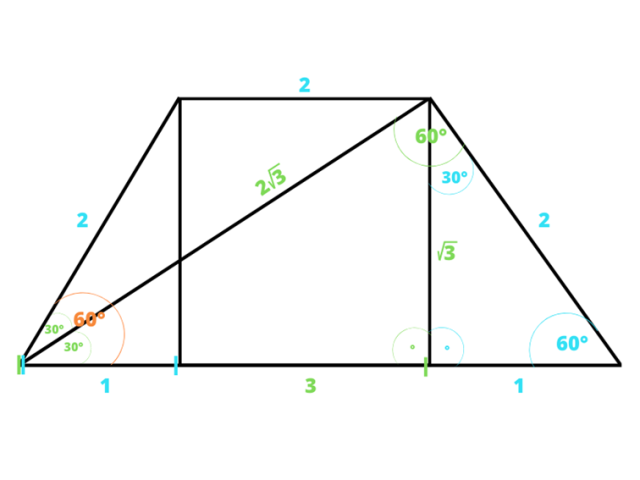Korzystając z własności trójkąta 30°, 60°, 90° obliczamy długość poszczególnych odcinków jak na rysunku wyżej. Następnie obliczamy: