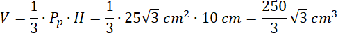 Jedna z krawędzi bocznych jest prostopadła do płaszczyzny podstawy i jest równa długości krawędzi podstawy, to znaczy, że wysokość ostrosłupa wynosi 10 cm. Możesz obliczyć objętość ze wzoru: