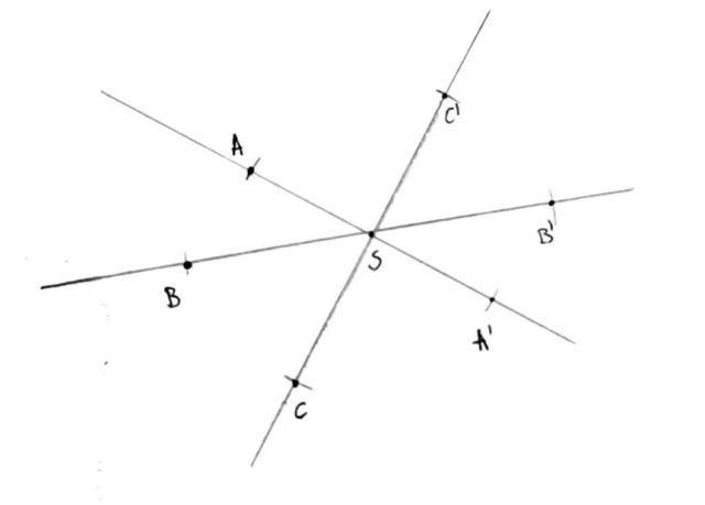 Narysuj 4 punkty: A, B, C oraz S. Poprowadź proste łączące każdy z punktów A, B, C z punktem S. Następnie wbij cyrkiel w punkt S i odznacz na każdej prostej odległość punktu od punktu S. Podpisz punkty symetryczne względem punktu S jako: A’, B’, C’.