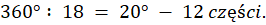 Wiedząc, że koło zostało podzielone na 18 jednakowych części, możesz wyznaczyć kąt zakreślony przez jedną część, zatem 360° : 18 = 20°. W celu zamalowania wycinka o polu równym 6π należy zamalować 12 części.
