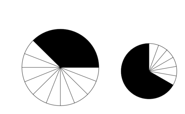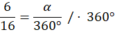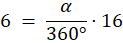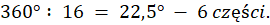 Wiedząc, że koło zostało podzielone na 16 jednakowych części, możesz wyznaczyć kąt zakreślony przez jedną część, zatem 360° : 16 = 22,5°. W celu zamalowania wycinka o polu równym 6π należy zamalować 6 części.