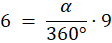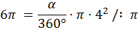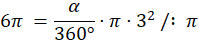 , gdzie α oznacza kąt zakreślony przez dany łuk, natomiast r oznacza promień danego łuku. Wiedząc, że pole wycinka jest równe 6π, Podstaw do powyższego wzoru.