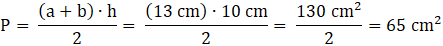 Po policzeniu wymiarów trapezu i pomnożeniu wartości pole wynosi 65 cm2.