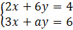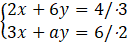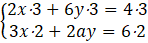 Aby układ równań był nieoznaczony wyrażenia po lewej stronie i po prawej stronie układu muszą być takie same, czyli aby spełnić ten warunek pierwsze równanie mnożymy obustronnie przez 3 a drugie przez 2 i porównujemy równania: