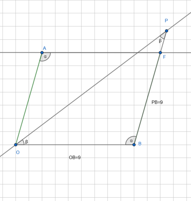 Jeżeli kąty naprzemianległe przy wierzchołkach A i B są równe, to prosta PB jest równoległa do prostej AO.