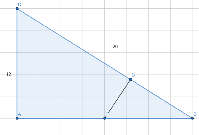 Oblicz z twierdzenia Pitagorasa długość |AB|, co pozwoli policzyć |AC| i |BC|. Zauważ, że trójkąty ABC i BDP są podobne (KKK) jeden kąt prosty i kąt wspólny.