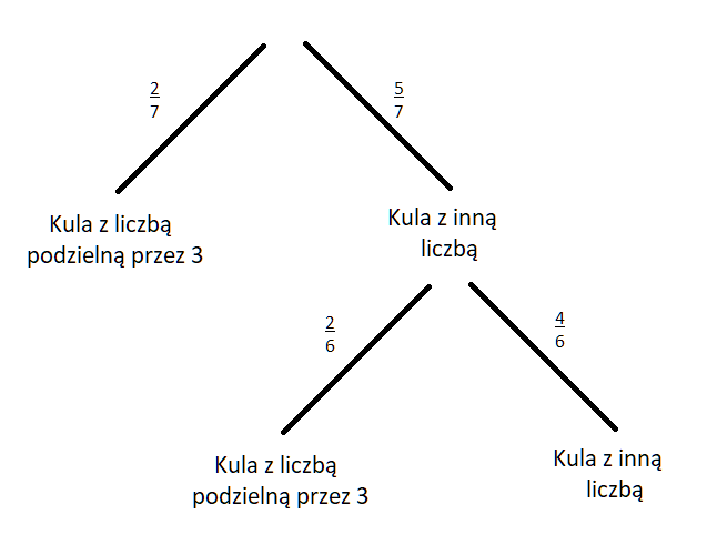 B – w pierwszym losowaniu wylosuje się kulę z liczbą nie dzielącą się przez 3, ale w drugim losowaniu wylosuje się taką kulę