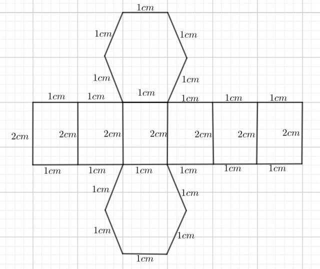 Krawędź podstawy graniastosłupa prawidłowego sześciokątnego ma długość 1 cm, a jego krawędź boczna ma 2 cm. Narysuj siatkę tego graniastosłupa.