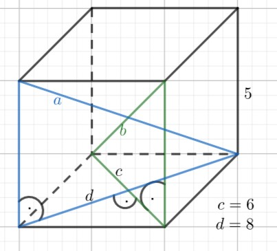 Zauważ, że przekątne tego graniastosłupa tworzą wraz z jego wysokością i odpowiednią przekątna podstawy dwa trójkąty prostokątne. Przekątne graniastosłupa są przeciwprostokątnymi tych trójkątów. Ich długość oblicz z twierdzenia Pitagorasa.