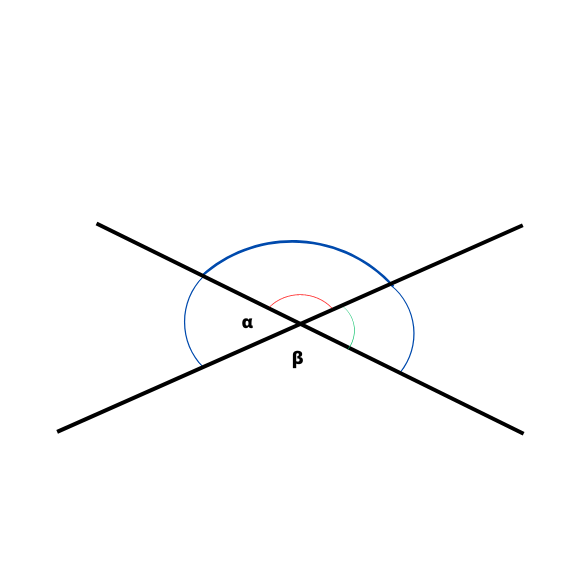 Kąt oznaczony na zielono jest kątem wierzchołkowym razem z kątem α , natomiast kąt oznaczony na czerwono jest kątem wierzchołkowym z kątem β.