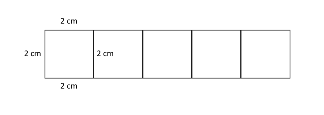 Utworzono prostokąt z 5 kwadratów, co oznacza, że długość jednego boku tego prostokąta jest równa tyle, ile 5 długości boku kwadratu, a drugi tyle, ile jeden bok kwadratu (2 cm).