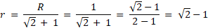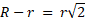 Zauważ, że odległość między środkami mniejszych okręgów oraz środkiem większego jest różnicą ich promieni (R – r). Stanowi ona ponadto średnicę kwadratu o długości mniejszego promienia (r). Z równania wyznacz tę długość.