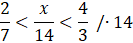 Aby rozwiązać nierówność musisz przemnożyć nierówność przez 14. Następnie musisz zapisać zbiór rozwiązań. W kolejnym kroku musisz znaleźć najmniejszą i największą liczbę całkowitą należącą do przedziału. Aby policzyć, ile liczb całkowitych znajduje się w tym przedziale wystarczy, że od największej z nich odejmiesz najmniejszą i dodasz 1.