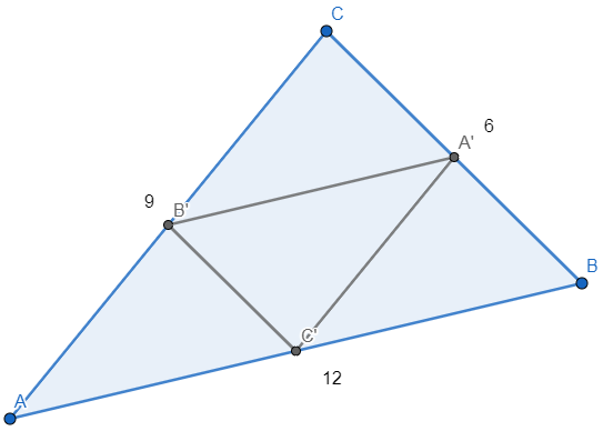 W tym zadaniu musisz obliczyć obwód trójkąta, którego wierzchołki są środkami boków trójkąta ABC o długościach