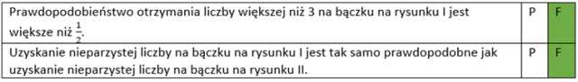 Uzyskanie nieparzystej liczby na bączku na rysunku I jest tak samo prawdopodobne jak uzyskanie nieparzystej liczby na bączku na rysunku II. | P | F |