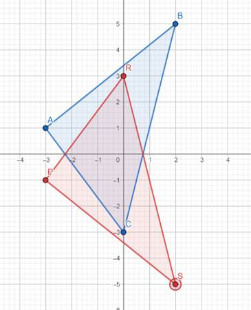 Zauważ, że oba te trójkąty są do siebie symetryczne względem osi OX układu współrzędnych. Punkt P jest odbiciem punktu A, a punkt R odbiciem punktu C. Punkt S musi być więc odbiciem punktu B, a jego współrzędne muszą być równe S=(2,-5)