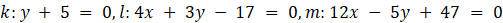 Równania prostych AB, BC i AC wyznaczysz w następujący sposób: