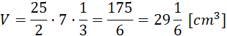 Wypisz znane dane, zastosuj wzór na pole trójkąta prostokątnego, w którym jedna z przyprostokątnych jest wysokością oraz objętość ostrosłupa, jako iloczyn pola podstawy i wysokości. Otrzymany wynik podziel na 3.