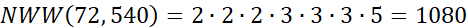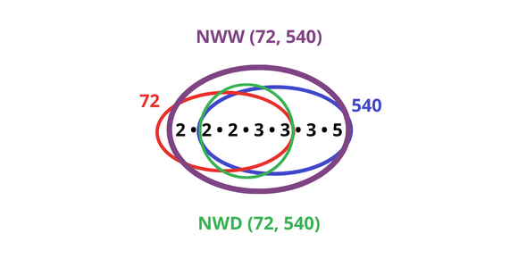 W tym zadaniu musisz rozłożyć na czynniki pierwsze 72 i 540, czyli zapisać je w postaci iloczynów liczb pierwszych (takich, które mają dokładnie 2 dzielniki – 1 i samą siebie). Następnie musisz narysować diagram analogiczny do tego ze str. 82, dzięki niemu odczytasz NWW i NWD liczb 72 i 540.