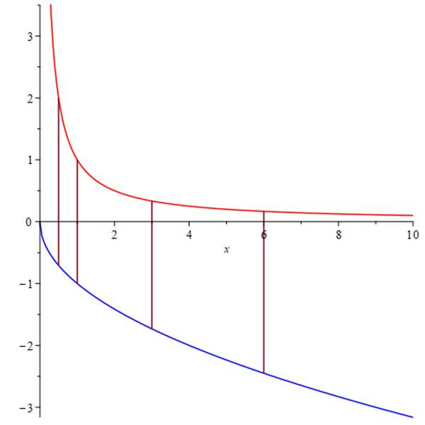 (kolor niebieski) mają różne długości zależne od argumentu. Długość takiego odcinka zadana jest przez moduł różnicy rzędnych funkcji czerwonej z niebieską, tzn.: