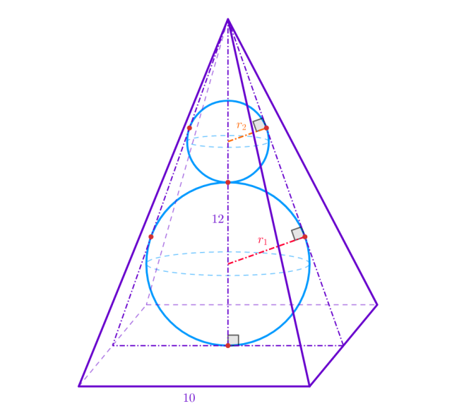 Dany jest ostrosłup prawidłowy czworokątny o długości krawędzi podstawy 10 i wysokości 12. Do ostrosłupa wpisano kulę, po czym wpisano kolejna, mniejszą kulę w taki sposób, że kule są ze sobą styczne oraz mniejsza kula jest styczna do czterech ścian bocznych ostrosłupa. Oblicz promienie kul.