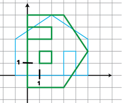 Szczyt niebieskiego domku ma współrzędne (2,5). Zamieniamy współrzędną x na y i odwrotnie. Szczyt zielonego domku będzie miał współrzędne (5,2). W ten sam sposób zamieniamy współrzędne wszystkich punktów.