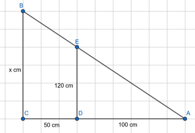 Zauważ, że skoro proste BC i ED są równoległe, to kąty ACB i ADE oraz ABC i AED mają równe miary, więc trójkąty przedstawione na rysunku są podobne z cechy KKK. Oznacza to, że skalę ich podobieństwa możesz obliczyć z ilorazu długości boków w obu trójkątach leżących przy tych samych miarach kątów, czyi w tym przypadku długości cieni obu mężczyzn.